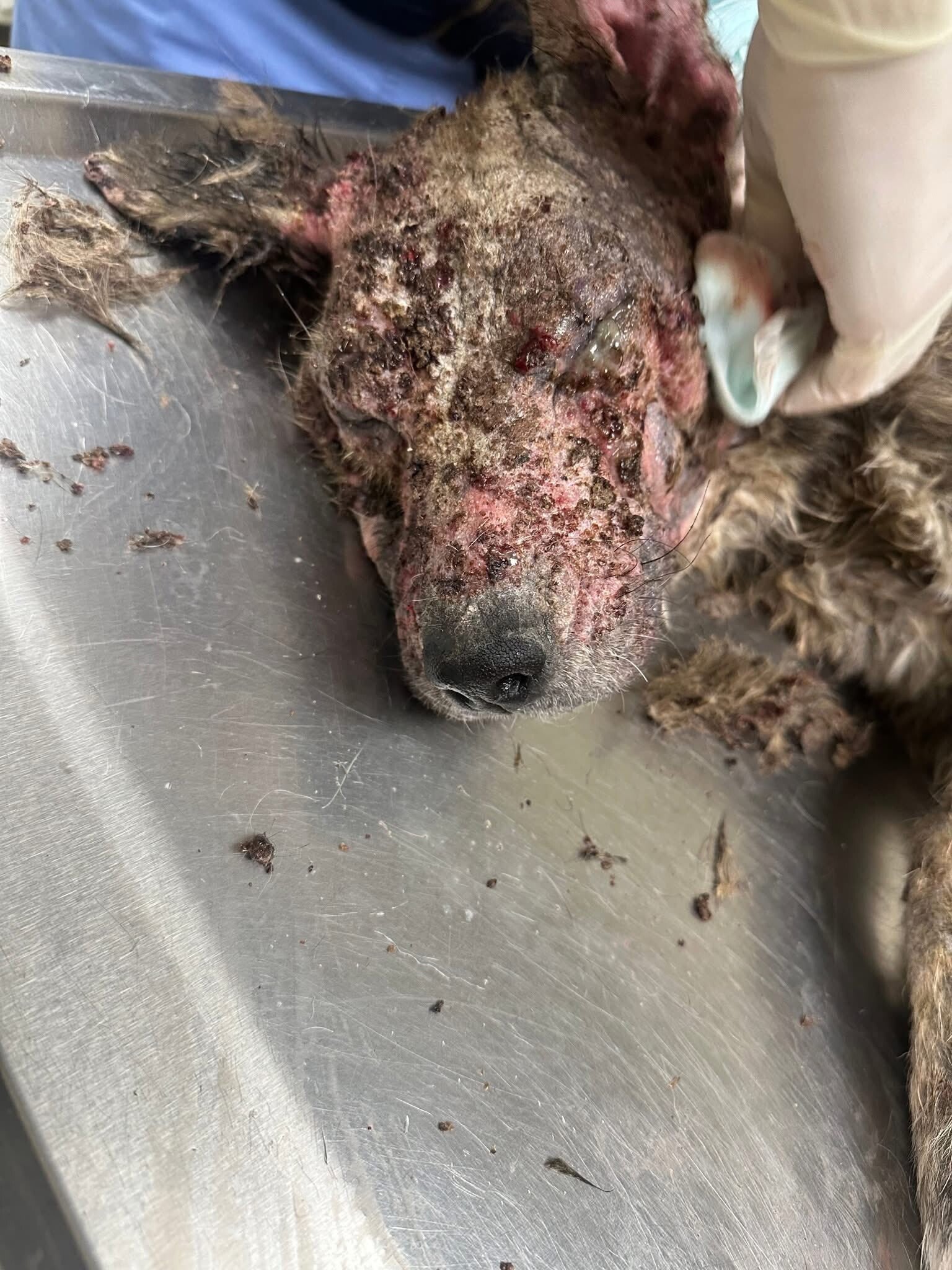 Rusty was kept at the veterinary hospital where she received emergency care and treatment. We made sure she stayed there until she was medically cleared and stable enough to safely come into our care. Her healing came first—always.